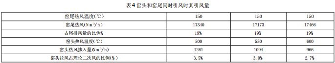 由上述计算分析可知,若从尾排风机出口引风,风温低时无法满足煤磨对烘干热源的要求,需补充热量。采用由窑头拉风补充,则其风量及组成如下表4所示。